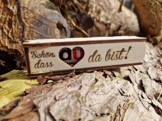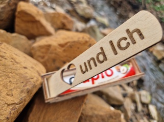 Der Deckel hat eine Öffnung, entweder in Herzform oder als Quadrat, sodass man dadurch das Wort DU vom Schokoriegel lesen kann. Zusätzlich sind auf dem Deckel unterschiedliche Texte graviert, sodass man z.B. folgende Texte kreieren kann: